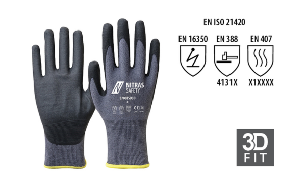 Rękawice robocze Nitras 8700 ESD 3D zostały wykonane z elastycznej, specjalistycznej tkaniny z dodatkiem włókna węglowego, które skutecznie zabezpiecza urządzenia elektroniczne przed wyładowaniami elektrostatycznymi. Wewnętrzną stronę rękawic oraz opuszki palców pokrywa czarna powłoka o podwyższonej wytrzymałości mechanicznej, gwarantując pewny i precyzyjny chwyt. Zastosowanie dzianych ściągaczy oraz anatomicznego kroju 3D FIT sprawia, że rękawice idealnie dopasowują się do dłoni, zapewniając wysoki komfort pracy. Charakteryzują się bardzo dobrą oddychalnością, odpornością na ścieranie i rozdarcia, chronią przed ciepłem kontaktowym do 100°C, oraz umożliwiają obsługę ekranów dotykowych.