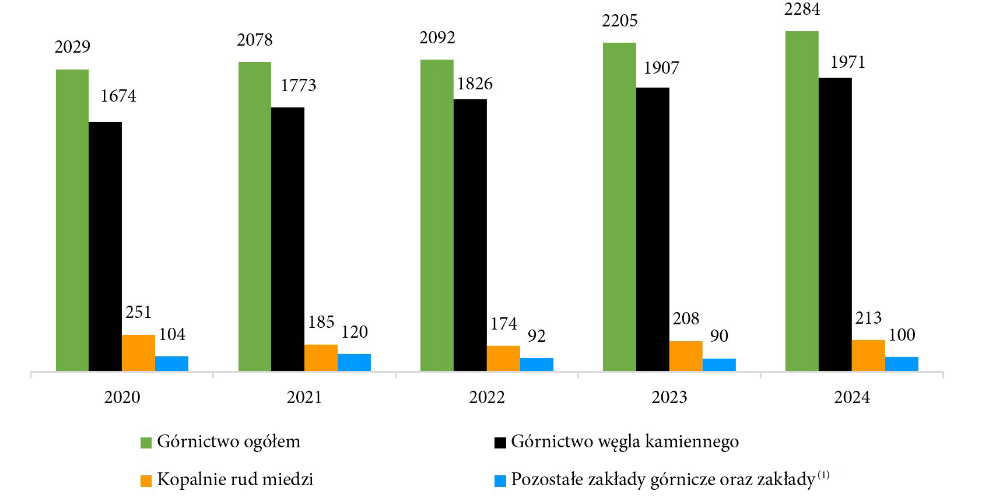Wskaźnik wypadków ogółem na 1 000 zatrudnionych w górnictwie w latach 2020-2024 wynosił od 11,3 do 13,9. Najniższą wartość osiągnął w 2020 r., a najwyższą w 2024 r. Wskaźnik wypadków śmiertelnych i ciężkich na 1 000 zatrudnionych w latach 2020-2024 wynosił od 0,12 do 0,29. Najniższy odnotowano w 2024 r., a najwyższą w 2022 r., przy czym: