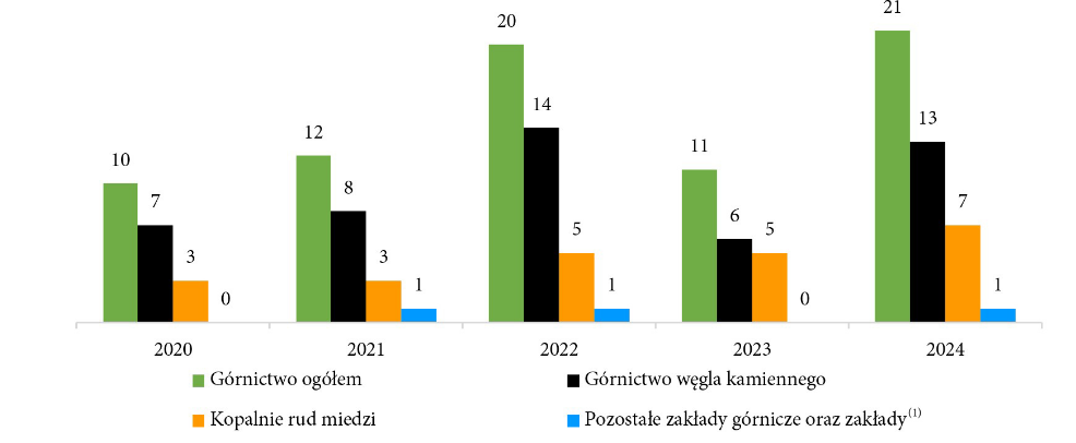 W polskim górnictwie w latach 2020-2021 oraz 2023-2024 liczba wypadków śmiertelnych wynosiła od 13 do 16 wypadków. Natomiast odnotowano w 2022r. wzrost wypadkowości (37 wypadków śmiertelnych), spowodowany wystąpieniem dwóch katastrof górniczych, w których łącznie zginęło 26 górników. W latach 2020-2024 w polskim górnictwie odnotowano spadek liczby wypadków ciężkich – z 13 w 2020r. do 3 w 2024r.