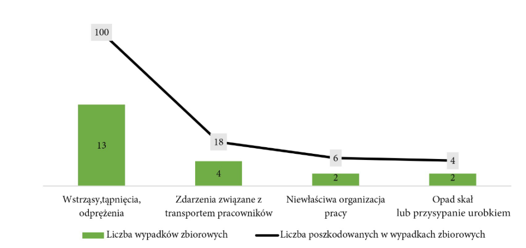 Analiza wypadków zbiorowych w górnictwie w latach 2020-2024 wykazała, że najwięcej zdarzeń miało miejsce w 2024r. – 21 wypadków. W tym 13 w górnictwie węgla kamiennego, 7 w kopalniach rud miedzi oraz jedno zdarzenie w kopalni węgla brunatnego. Najmniej wypadków zbiorowych wystąpiło w 2020 r. – 10, w tym 7 w górnictwie węgla kamiennego.