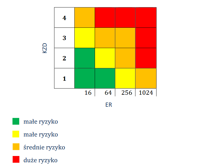 Ostateczną ocenę ryzyka dermalnego przeprowadza się na podstawie histogramu, który uwzględnia kategorię zagrożenia dermalnego (KZD) (od 1 do 4; tab. 6.) oraz poziom narażenia dermalnego (ER) (rys. 5.).