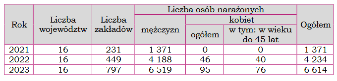 Dane dotyczące liczby narażonych osób pochodzą z rejestru CRCR. Dotyczą one działania olejów mineralnych przepracowanych w silnikach spalinowych. Statystyki te obejmują okres trzech lat. Wynika to z faktu, że dopiero od 2021 r. wprowadzono obowiązek zgłaszania tego czynnika. W Tabeli przedstawiono liczbę pracowników narażonych na działanie przepracowanych olejów mineralnych zgłaszanych do CRCR prowadzonego w Instytucie Medycyny Pracy im. prof. dr med. J. Nofera w Łodzi.
