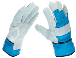 | Materiał/surowiec | Wzmocnienie części dłoniowej i palców wykonane z naturalnej dwoiny, część wierzchnia dłoni wykonana z niebieskiej bawełny, marszczenie w nadgarstku, wzmocnienie śródręcza wykonane z dwoiny, końcówki palców z dwoiny | ||
