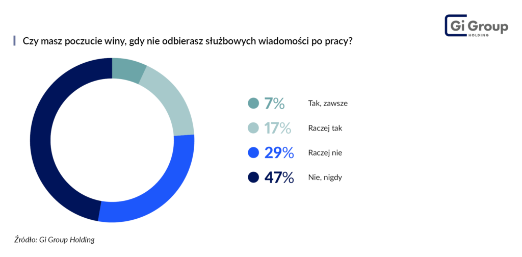 Tego rodzaju sytuacje mają poważne konsekwencje dla pracowników, co potwierdzają wyniki dotyczące presji emocjonalnej. 24% respondentów ankiety Gi Group Holding wskazuje, że odczuwa wyrzuty sumienia lub presję, gdy nie reaguje na służbowe wiadomości po pracy. To niepokojący sygnał, który wskazuje, jak silnie wpływają nieformalne oczekiwania dotyczące dostępności na komfort psychiczny pracowników. Nawet jeśli organizacja nie ustala takich zasad formalnie, w wielu firmach wyczuwalne jest przekonanie, że bycie dostępnym przez 24 godziny na dobę jest częścią obowiązków zawodowych.