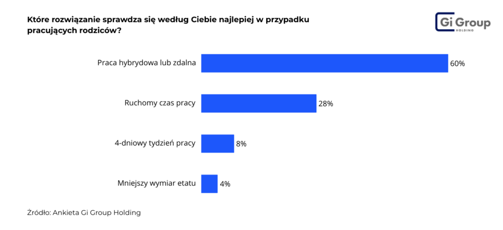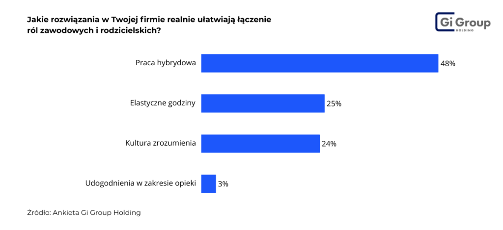 Wyniki ankiet Gi Group Holding pokazują, że kluczowa jest elastyczna organizacja pracy. Ułatwia ona mianowicie godzenie obowiązków zawodowych z rodzicielskimi. Najczęściej wskazywanym rozwiązaniem jest praca hybrydowa – wybiera ją 48% respondentów. Na kolejnych miejscach znalazły się elastyczne godziny pracy (25%) oraz kultura organizacyjna oparta na zrozumieniu potrzeb rodziców, którą wymieniło 24% respondentów. Tylko niewielki odsetek badanych opowiedział się za udogodnieniami w zakresie opieki (3%).