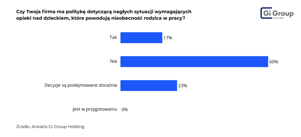 Świadomość wyzwań związanych z wychowaniem dzieci rośnie. Jednakże takie rozwiązania nadal nie są powszechną praktyką, co potwierdza ankieta Gi Group Holding. 60% respondentów przyznało, że w ich organizacjach nie ma polityki dotyczącej sytuacji, które wymagają nagłej opieki nad dziećmi. 17% ankietowanych potwierdziło ich wprowadzenie, a 23% podkreśliło, że decyzje w takich przypadkach zapadają indywidualnie i zależą od bieżących okoliczności.