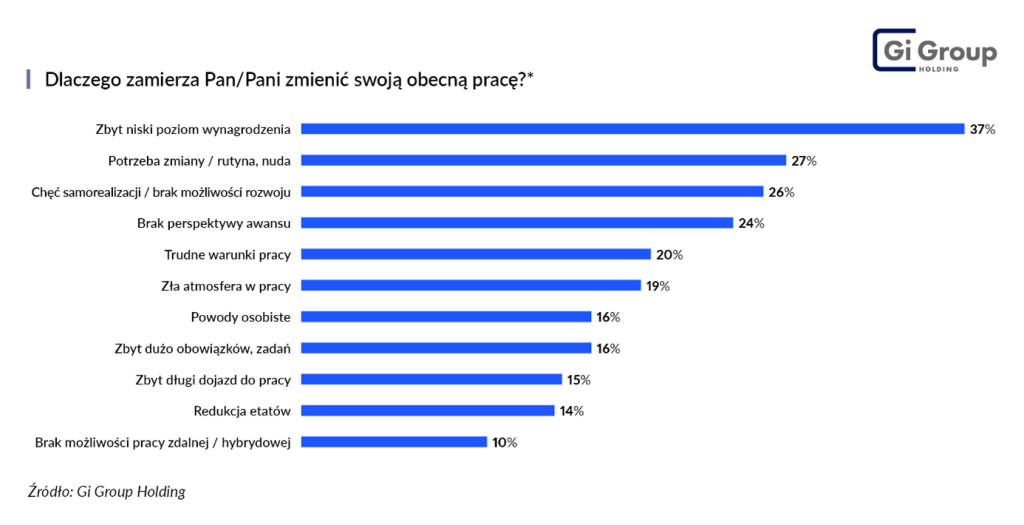 Potwierdzają to badania. Z tegorocznego „Barometru Rynku Pracy” Gi Group Holding wynika, że jednym z kluczowych czynników skłaniających pracowników do zmiany pracy jest ograniczona ścieżka rozwoju zawodowego. Wśród najczęściej wskazywanych powodów znalazły się: