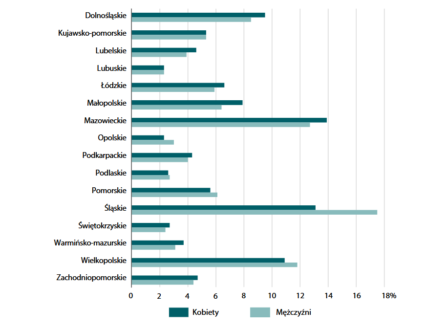 Uwzględniając podział terytorialny kraju, najwięcej osób poszkodowanych w wypadkach przy pracy odnotowano w województwie śląskim (15,7%). Na drugim miejscu znalazło się województwo mazowieckie (13,2%). Na trzecim województwo wielkopolskie (11,4%). Najmniej poszkodowanych było w województwach: lubuskim (2,3%), świętokrzyskim (2,5%) i podlaskim (2,7%).