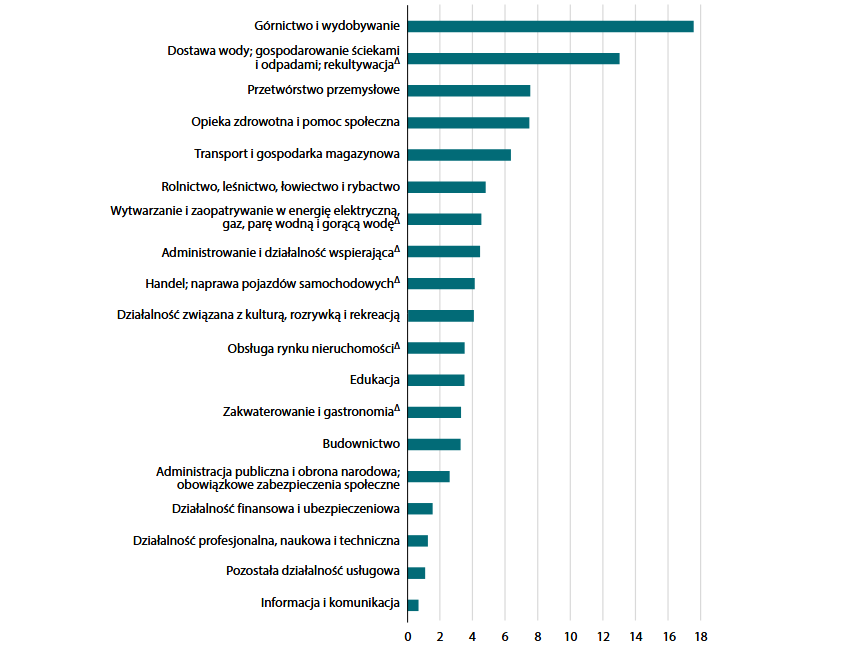 W podziale według rodzajów działalności najwyższy wskaźnik wypadkowości odnotowano w sekcji górnictwo i wydobywanie (17,57). Wysoki poziom wystąpił także w sekcji dostawa wody; gospodarowanie ściekami i odpadami; rekultywacja (13,03). Najniższy wskaźnik zanotowano w sekcji informacja i komunikacja (0,69). Niski poziom odnotowano również w sekcji pozostała działalność usługowa (1,10).