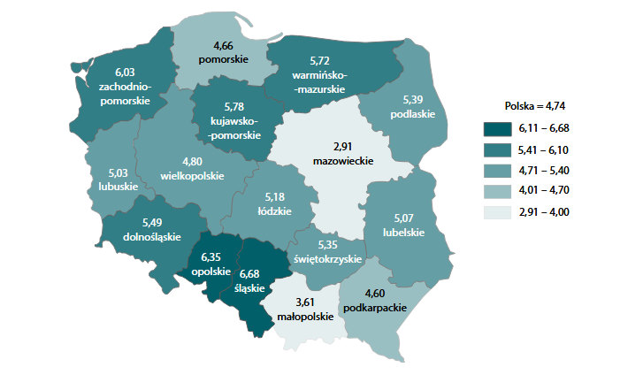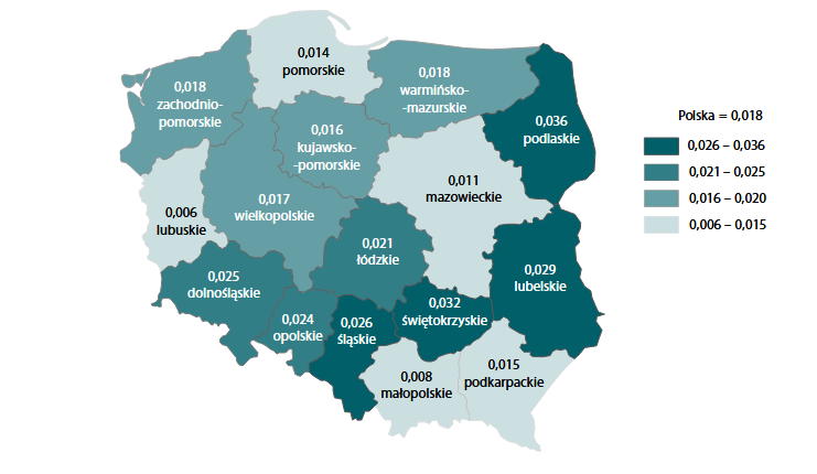 Biorąc pod uwagę podział terytorialny kraju najwyższy wskaźnik wypadkowości odnotowano w województwie śląskim (6,68) i opolskim (6,35), a najniższy w mazowieckim (2,91) i małopolskim (3,61).
