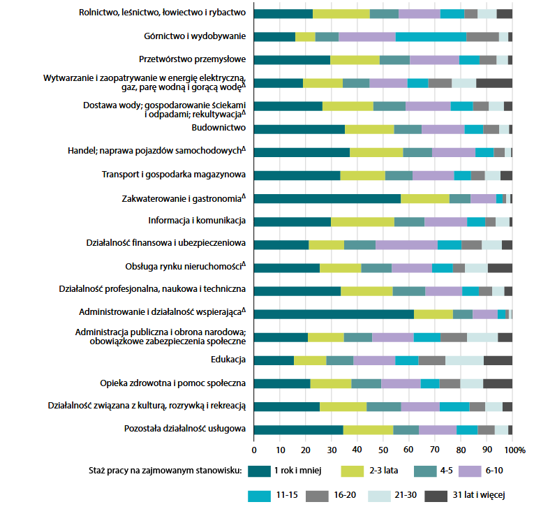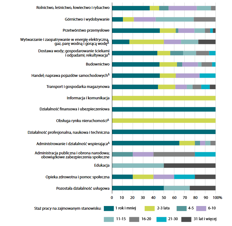 Wypadkom ulegali głównie pracownicy ze stażem pracy wynoszącym 1 rok i mniej (30,1% poszkodowanych). W tej grupie największy udział poszkodowanych odnotowano w sekcji przetwórstwo przemysłowe (30,8%).