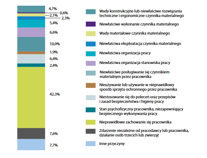 Nieprawidłowe zachowanie się pracownika było również najczęstszą przyczyną wypadków śmiertelnych i ciężkich (odpowiednio 29,5% oraz 29,4%).