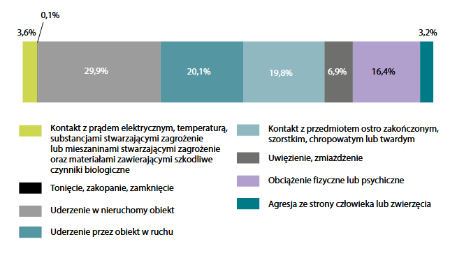 Wśród wydarzeń powodujących urazy przeważało uderzenie w nieruchomy obiekt – 29,9% (źródłem były głównie czynniki materialne z grupy budynki, konstrukcje i ich elementy, powierzchnie – 60,7% ogólnej liczby czynników w tej grupie wydarzeń).